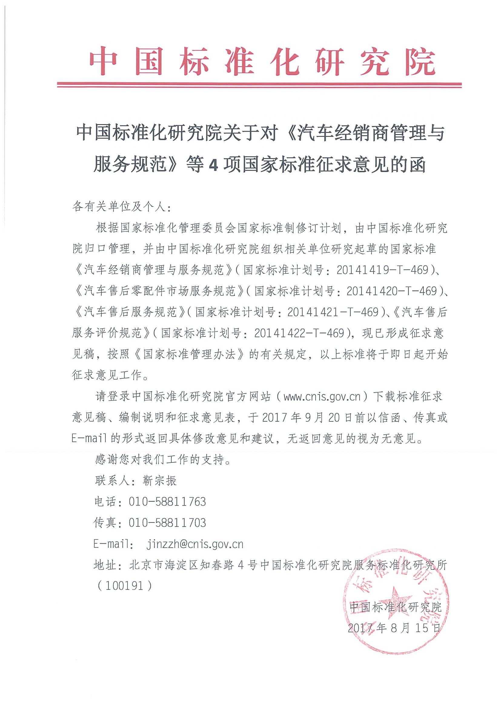 在国家的高度关注和行业的大力推动下,历时两年多时间,根据国家标准化管理委员会国家标准制修订计划,由中国标准化研究院归口管理,中国标准化研究院、中国汽车流通协会共同组织相关单位研究起草的四项国家标准《汽车经销商管理与服务规范》《汽车售后零配件市场服务规范》《汽车售后服务规范》及《汽车售后服务评价规范》,现已形成征求意见稿,按照《国家标准管理办法》的有关规定,以上标准于即日起向社会公开征求意见