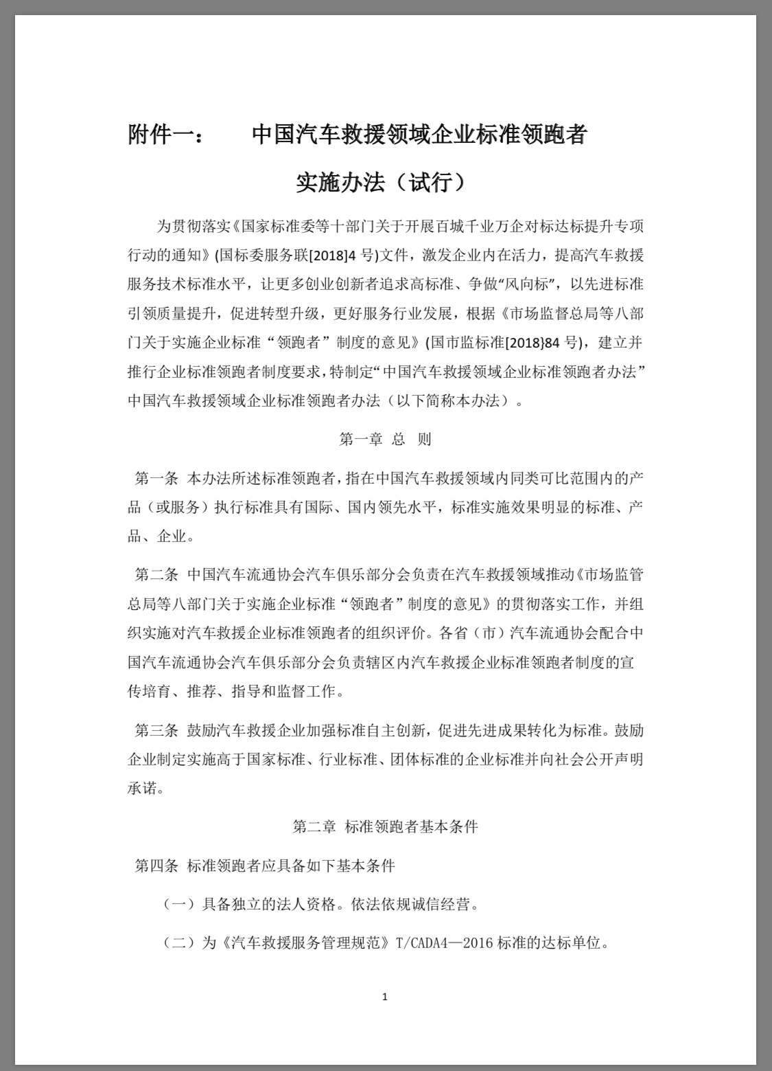 中国汽车救援领域企业标准领跑者实施办法(试行)