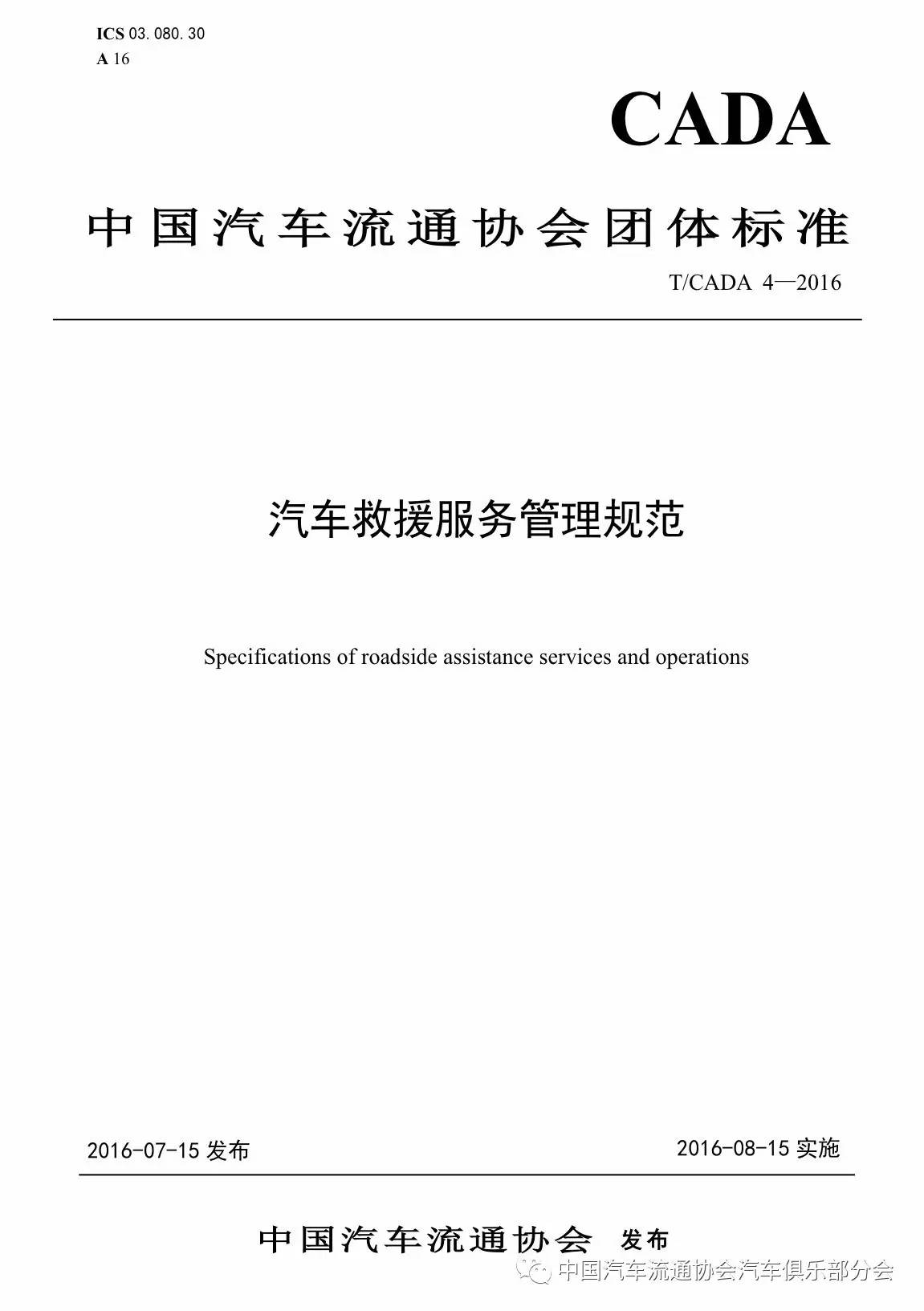 中国汽车流通协会根据国家质检总局颁发的《质检总局办公厅关于开展“汽车售后服务质量提升”行动的通知》精神,建立了《汽车救援服务管理规范》(T/CADA 4—2016),并在行业调研的基础之上,积极开展了行业从业人员认证、企业评优、企业达标等系列的宣标、贯标活动,推动标准的执行与落实。目前《汽车救援服务管理规范》在行业间得到广泛的认知与引用。