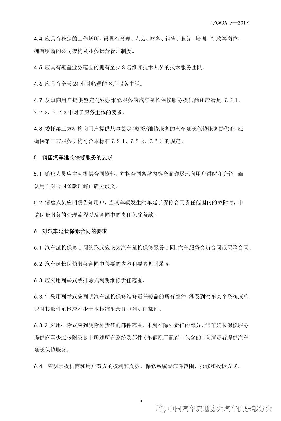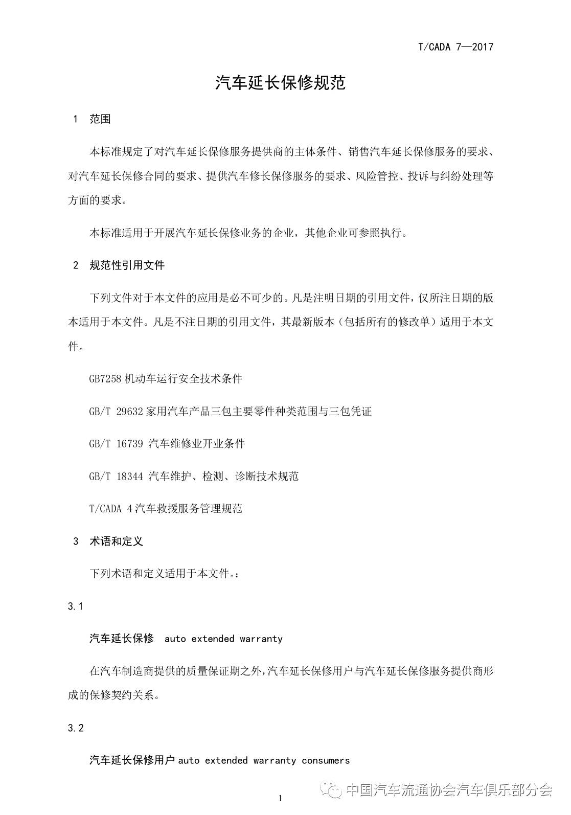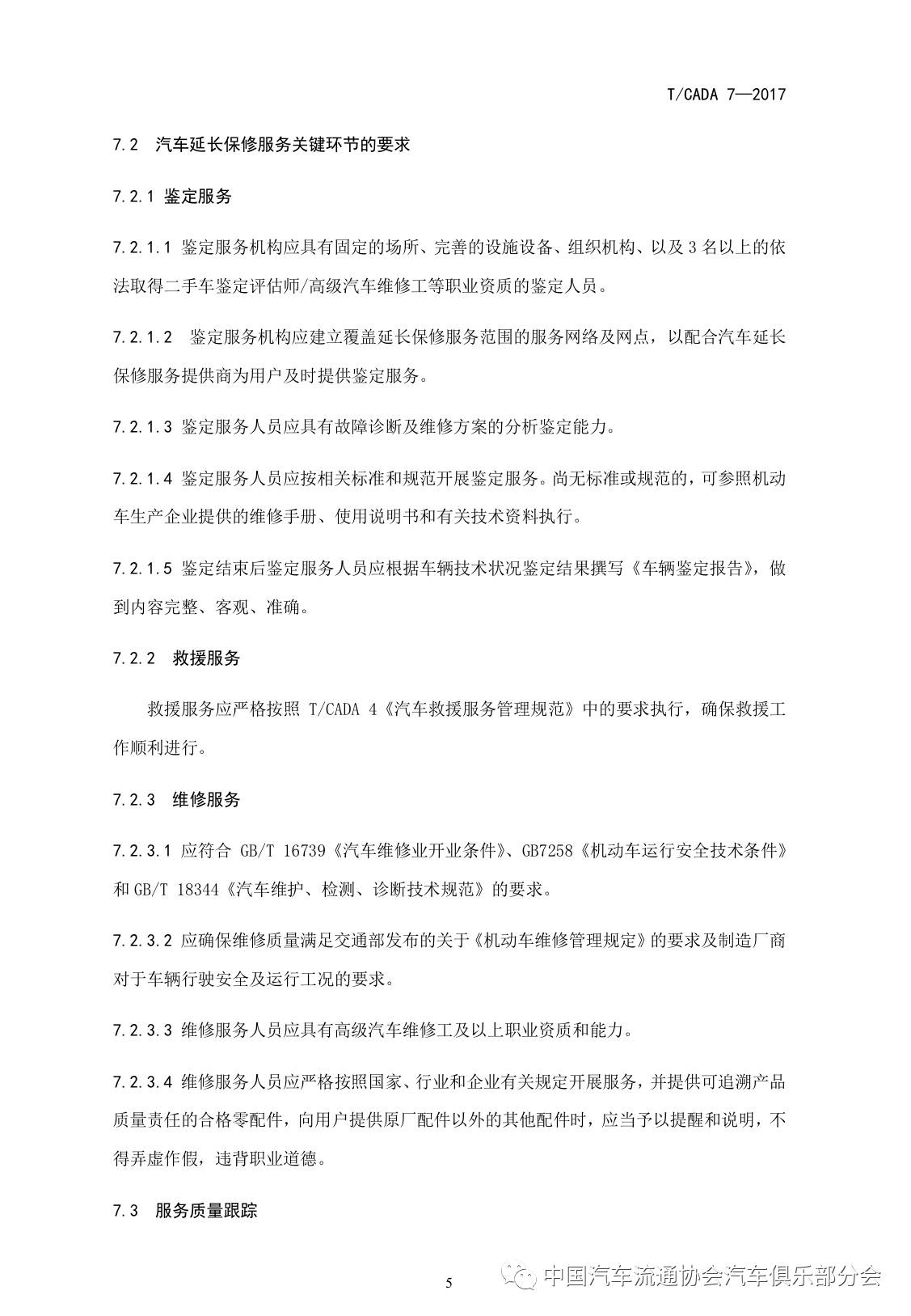 最近出台的《汽车延长保修规范》T/CADA 7-2017 引用了《汽车救援服务管理规范》的相关内容。《汽车延长保修规范》中“4.8 委托第三方机构向用户提供从事鉴定/救援/维修服务的汽车延长保修服务提供商,应确保第三方服务机构符合本标准 7.2.1、7.2.2、7.2.3 的规定。” “7.2.2救援服务。救援服务应严格按照 T/CADA 4《汽车救援服务管理规范》中的要求执行,确保救援工作顺利进行。”