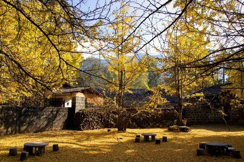 古老而古朴的银杏树,有声有息,隐于群山环抱,现于农庄炊烟之间,没有太多人的打扰,没有太多的俗气,更没有丝毫的商业气息。沿着江东村由火山石铺成的小道,慢慢走进古银杏村时,一地金黄,小路上、墙头上、瓦房上、水沟边、菜地里,漫步村中小巷,不经意间,银杏叶洒满一身,与夕阳的余辉融为一体……