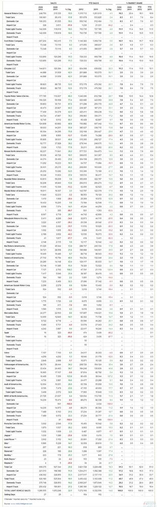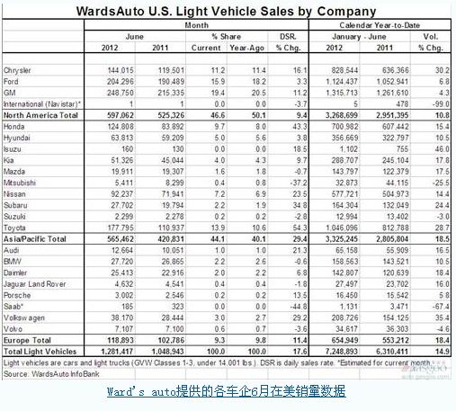 Autodata公司提供的美国车市6月及上半年销量数据 通用汽车:6月全面增长 通用汽车今年6月在美销量为248,750辆,同比增长15.5%;上半年在美销量达1,315,713辆,同比增长4.3%。 雪佛兰品牌6月在美销量同比增长14.8%至180,098辆;上半年在美销量共计961,662辆,同比增长6.3%。 GMC品牌6月在美销量同比增长14.9%至37,677辆;上半年在美累计销量同比增长7.3%至201,041辆。 别克品牌6月在美销量为18,851辆,同比增长26.8%;上半年累计销量为90,198辆,同比下降3.6%。 凯迪拉克品牌6月在美销量12,124辆,同比增长11.6%;上半年累计销量62,812辆,同比下降17.5%。 福特:6月保持今年平均步调 福特汽车今年6月在美国市场销量为207,204辆,而去年6月为193,415辆,同比增长7.1%;上半年销量为1,140,383辆,在去年同期1,069,736辆的基础上同比提高6.6%。 福特业务部的福特品牌6月销量从186,054辆同比增长7.3%至199,660辆;上半年从1,027,485辆同比提升6.9%至1,098,421辆。林肯品牌6月销量从7,361辆同比增长2.5%至7,544辆;上半年从42,003辆同比略下降0.1%至41,962辆。水星品牌去年上半年累计销量248辆,今年该品牌无销量。 克莱斯勒:增长领衔三巨头 2012年6月,克莱斯勒集团在美国市场销量144,811辆,比去年6月的120,394辆增长20.3%;上半年在美累计销量834,068辆,较去年同期的639,932辆提高30.3%。集团旗下克莱斯勒、道奇、Jeep和Ram(公羊)品牌均实现增长。 各品牌销量情况: 当月销量增幅最高的为克莱斯勒品牌,6月销量26,863辆,比去年同期的16,529辆增长63%;上半年累计销量167,754辆,较去年同期的96,068辆提高75%。 当月销量最高的为Jeep品牌,6月销量44,519辆,比去年同期的36,114辆增长23%;上半年累计销量241,547辆,较去年同期的188,924辆提高28%。 道奇品牌6月销量44,315辆,比去年同期的43,401辆增长2%;上半年累计销量261,578辆,较去年同期的229,898辆提高14%。 Ram品牌6月销量25,110辆,比去年同期的22,547辆增长11%;上半年累计销量142,483辆,较去年同期的120,098辆提高19%。 此外,菲亚特500车型6月销量4,004辆,上半年累计销量20,706辆。 丰田汽车:6成涨幅称雄,蝉联单一品牌销量冠军 丰田汽车成为6月份美国市场上同比增幅最高的主流车企,并且旗下丰田品牌也连续4个月成为在美销量最高的单一品牌。 6月份,丰田汽车在美销量为177,795辆,较去年的110,937辆同比骤增60.3%,由于销售日从26天增加到27天,因而按照每日销售速率DSR(Daily Sales Rate)计算,同比增长54.3%;上半年销量为1,046,096辆,而去年同期为812,788辆,同比提升28.7%,按照DSR同比提升27.0%。 丰田品牌在美6月销量为149,373辆,较去年的96,708辆同比增长55.5%;上半年销量为902,843辆,较去年同期的698,157辆同比增长29.3%。 雷克萨斯品牌在美6月销量为20,022辆,较去年的10,773辆同比增长85.9%;上半年销量为108,132辆,而去年同期为88,010辆,同比提升22.9%。 Scion品牌在美6月销量为8,400辆,较去年的3,456辆同比增长143.1%;上半年销量为35,121辆,较去年同期的26,621辆同比增长31.9%。