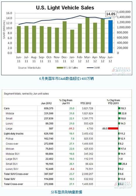 按照《华尔街日报》援引Motorintelligence.com的数据,今年6月份,美国市场轻型车销量为1,285,555辆,在去年6月份1,053,248辆的基础上同比增长22.1%;今年上半年总销量达到7,272,160辆,对比去年同期的6,332,566辆,同比增长14.8%。 按照Ward's auto数据,今年6月份,美国市场轻型车销量为1,281,417辆,而去年6月份为1,048,943辆,如果按照每日销售速率DSR(Daily Selling Rate)计算,同比增长17.6%;今年上半年总销量达到7,248,893辆,去年同期为6,310,411辆,按照DSR计算,同比增长14.8%。 尽管消费者对经济的信心仍不足,但多重因素促使销量增长。一方面居高的油价出现回落,另一方面6月各车企纷纷在美国上市新车;而美国当前汽车老龄化趋势明显,平均车龄达到11年的新高,也是消费者解囊购车的重要原因。