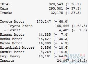 排除微型车,丰田汽车公司7月份销量居于榜首,同比增长60%至170,147辆;其次是本田销量同比增长35.5%至45,627辆;日产位于第三位,销量同比增长7.4%至44,885辆。