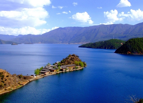 泸沽湖:为川滇两省界湖。为四川云南两省共有,四川约占总面积的2/3,云南占总面积的1/3。四川一侧湖岸线要比云南的湖岸线长得多。泸沽湖面积50多平方千米,海拔2690米,平均水深45米,最深处达93米,透明度高达11米,最大能见度为12米,湖水清澈蔚蓝,是云南海拔最高的湖泊,也是中国最深的淡水湖之一。湖中有5个全岛、三个半岛和一个海堤连岛,形态各异,翠绿如玉。