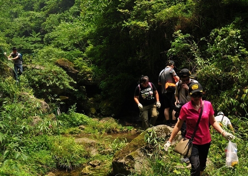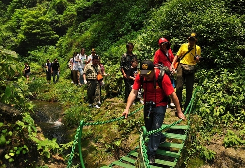 在安全员的带领下,车友们怀着兴高采烈的心情,欢呼雀跃的走进了大峡谷,一进入峡谷内,车友们就被眼前的原生态美景所迷住,谷内是溪水潺潺,水清林密,古藤参差阴郁,峭壁飞瀑洋溢者原始的芬芳,在接下来的旅程中,车友们脚踏圆形铁环,手抓铁链,身贴岩壁在峡谷溪流的上下游之间艰难前行,不断克服复杂多样的地形障碍,通过一个接一个的急流、瀑布,河滩,深潭,急流勇进、逆水前行,由于谷深坡陡,苔石湿滑,花婆,黑鬼,台胞亚玲……等等车友先后湿身,行走在峡谷间,溪谷中的宁静和凉爽真是大自然给与穿越者的一种最高享受,大家一边叭哒叭哒地滴着汗珠,一边呼哧呼哧地大口吸着负离子空气,6个小时的艰难穿越对于我们久未锻炼的车友们来说既是一种考验,也是一种成就,这次的穿行虽说身心十分疲累,但是征服万里长江第一大峡谷后的感觉却会让人心动一辈子。因为这是你们付出艰险后得到的胜利满足!