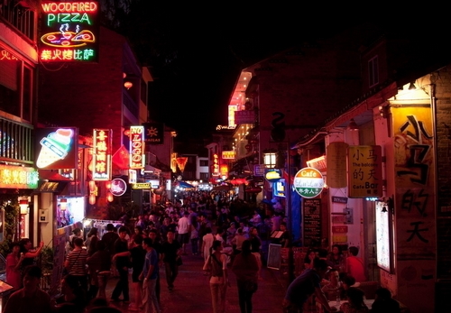 下午安排:大约下午2点左右抵达阳朔下船后,我们可逛具有三百年历史的、名登《世界旅游大典》,充满异国醉人情调的阳朔西街(洋人街)。之后跟随我们的导游踩着自行车沿着阳朔十里画廊,游览【大榕树】形神兼备且充满艺术感染力的中国山水画,一棵已有1400多年树龄的大榕树,相传是广西壮族歌仙刘三姐与阿牛哥的定情处。之后观看栩栩如生的【月亮山】,在车里感受月亮的瞬时变化。 游览著名的【蝴蝶泉景区】。晚上回到阳朔,可以尝尝当地的特色菜肴——啤酒鱼。温馨提示:阳朔码头下船后,由于码头距离阳朔县城较远,建议乘坐电瓶车抵达阳朔县城。