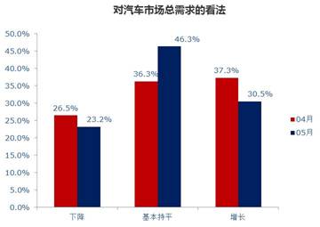 调查显示:约46.3%的被调查经销商认为5月汽车市场总需求与上月基本持平。认为增长的比例从4月份的37.3%降至30.5%。车市在五一期间一轮销量爆发后,呈现高开低走态势。5月汽车市场总需求量走势稳中略有下降。