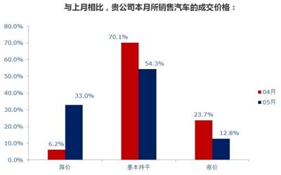 5月,经销商认为终端成交价格“下降”的比例有较大幅度增长,本月为33.0%,比上月的6.2%大幅增加。认为“涨价”的比例从上月的23.7%减少至12.8%,上涨的比例有所降低,认为“基本持平”的比例从上月70.1%减至54.3%。数据表明,由于5月市场需求稳中有降,导致市场价格有所下调。