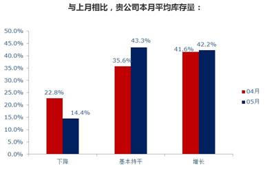 与上月相比,5月库存小幅上涨,经销商认为库存量“增长”的比例从41.6%小幅增至42.2%;“基本持平”的比例从35.6%增至43.3%;认为“下降”的比例从22.8%降至14.4%。数据表明,由于5月车市开始逐步走入淡季时期,市场需求量稳中有降,因此,5月库存量略有增加。